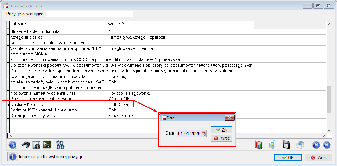 W Ustawieniach Globalnych, w ustawieniu Obsługa KSeF, należy wskazać datę z kalendarza, od której firma pracuje z KSeF.