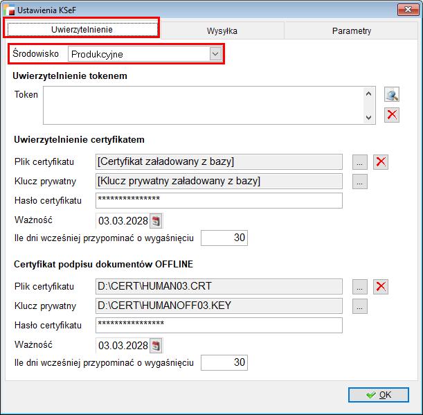 Na zakładce Uwierzytelnianie, w pierwszym wierszu należy wskazać środowisko, w którym prowadzona jest praca.
