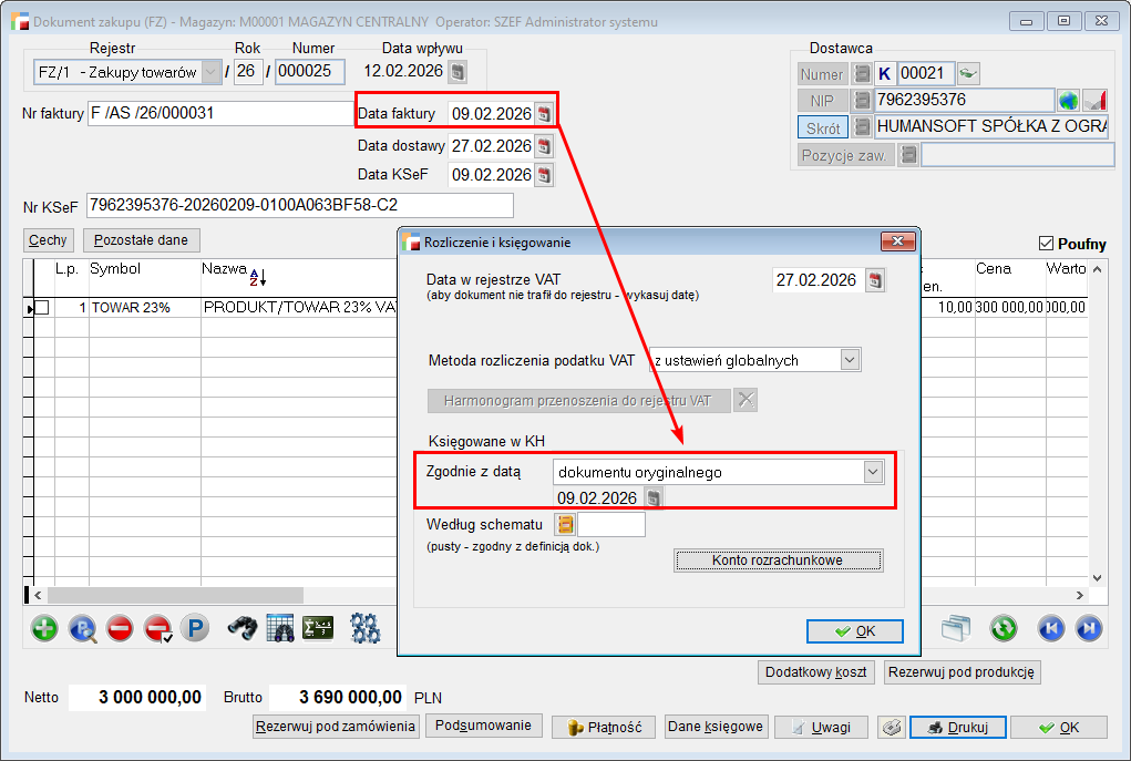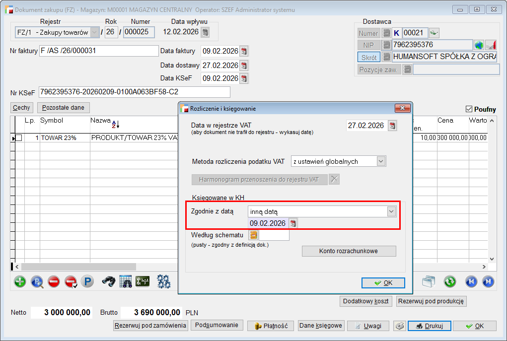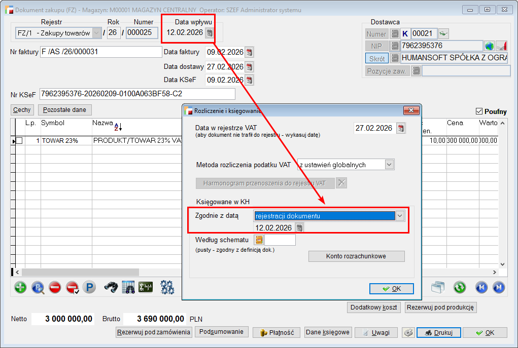 Księgowanie następuje według daty, w której dokument FZ został zarejestrowany w systemie – Data wpływu.