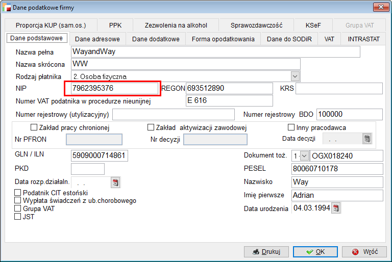 W menu należy przejść do menu Konfig, a następnie do Dane podatkowe firmy.