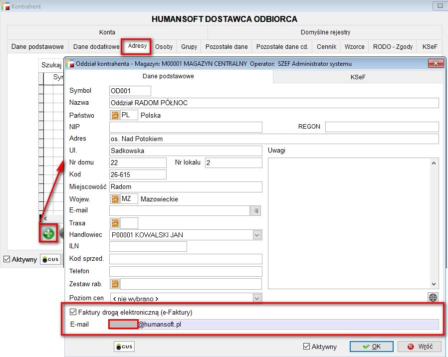 Funkcjonalność e-Faktur umożliwia wysłanie faktur elektronicznych na adres oddziału kontrahenta, z zakładki Adresy w kartotece kontrahenta.