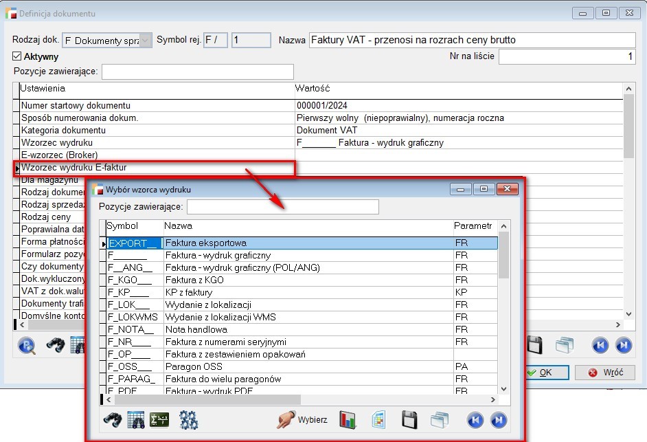 Lista ta pojawi się także w przypadku braku zdefiniowania wzorca wydruku e-Faktur w definicji dokumentu.