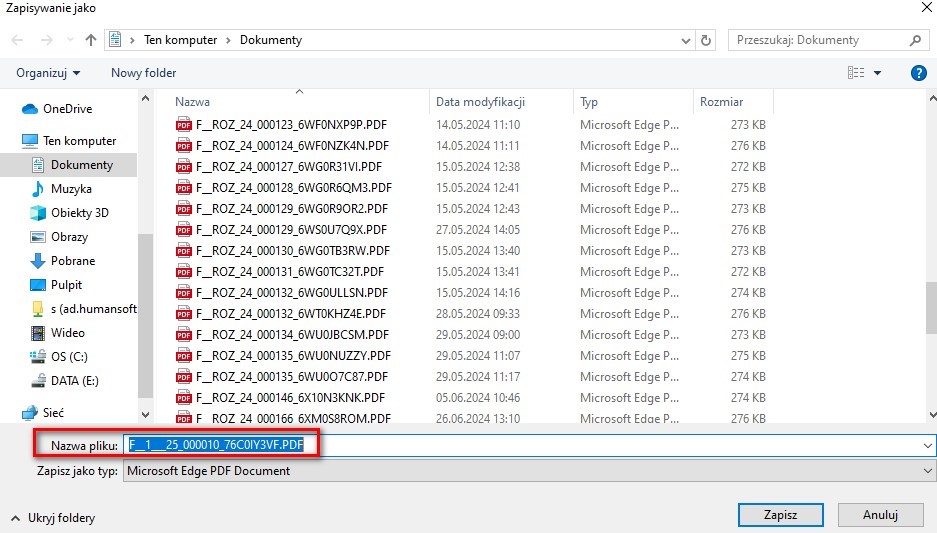 Istnieje możliwość otworzenia pliku lub zapisania do katalogu nadrzędnego, wskazanego w konfiguracji e-Faktur.