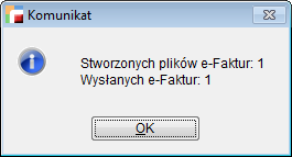 Po wysłaniu maila wyświetlony zostanie komunikat o ilości stworzonych plików e-Faktur oraz o ilości wysłanych maili zawierających e-Faktury.