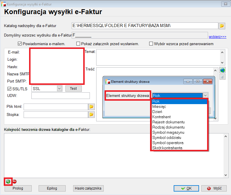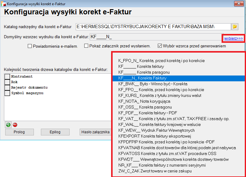 Podobnie jak w przypadku konfiguracji e-Faktur, możliwe jest ustalenie kolejności tworzenia drzewa katalogów: