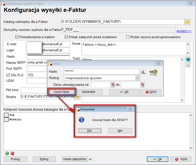 W przypadku próby usunięcia hasła, pojawi się komunikat: Usunąć hasło dla: EFAKT?