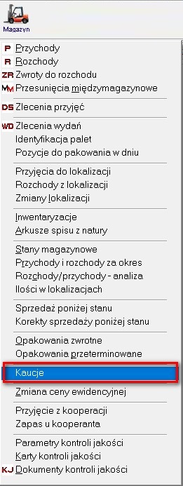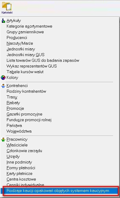 W menu Kartoteki dodana została opcja Rodzaje kaucji opakowań objętych systemem kaucyjnym.