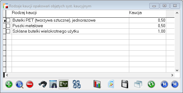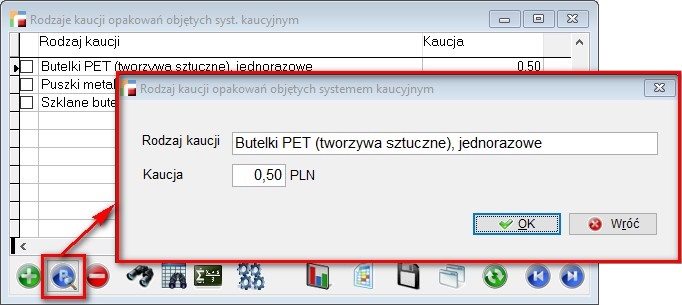 Przy rodzaju kaucji definiuje się kwotę kaucji za 1 opakowanie.