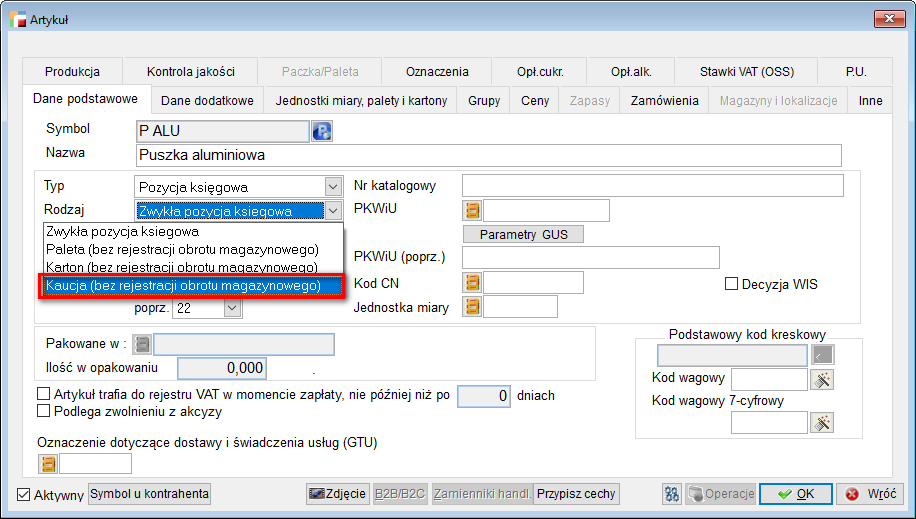Na formularzu tworzenia nowego artykułu, po wskazaniu typu artykułu Pozycja księgowa, w rodzaju artykułu dodana została opcja Kaucja (bez rejestracji obrotu magazynowego).