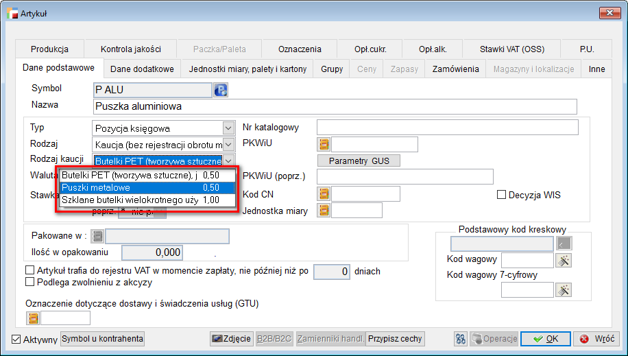 Po wybraniu tej opcji, do artykułu można przypisać rodzaj kaucji, zdefiniowany w opcji Rodzaje kaucji opakowań objętych systemem kaucyjnym w menu Kartoteki.