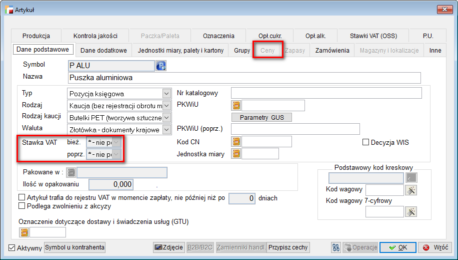 Podczas rejestracji takiej pozycji księgowej niedostępna staje się zakładka dotycząca cen, co oznacza, że nie można ich z tego miejsca zdefiniować, jak również artykuł nie podlega rabatom i promocjom. Nie jest również możliwa zmiana stawki VAT. Podczas sprzedaży artykułu cena będzie pobierana z rodzaju kaucji.