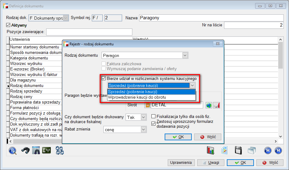 W definicji dokumentów sprzedaży, na formularzu definicji rodzaju dokumentu dodano znacznik Bierze udział w rozliczeniach systemu kaucyjnego, a po jego zaznaczeniu pojawia się możliwość zdefiniowania operacji w systemie kaucyjnym.