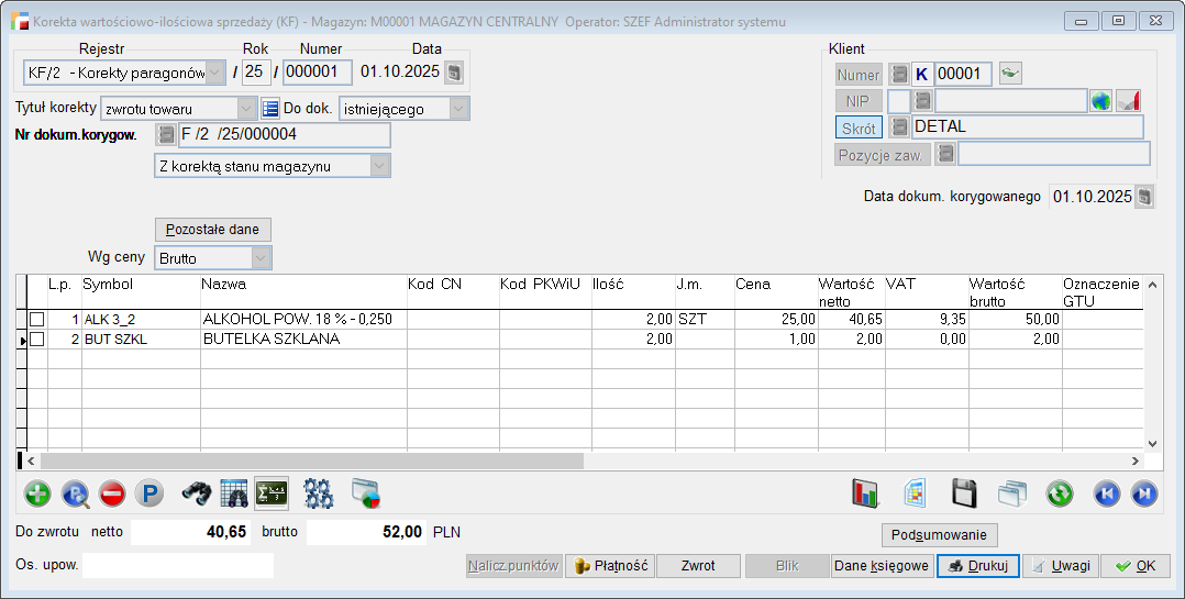 Korekta służy do ręcznego skorygowania ilości i wartości kaucji. Możliwe jest wprowadzanie wartości ujemnych.