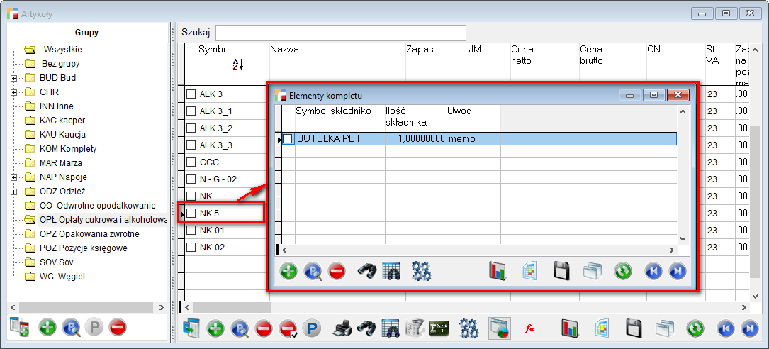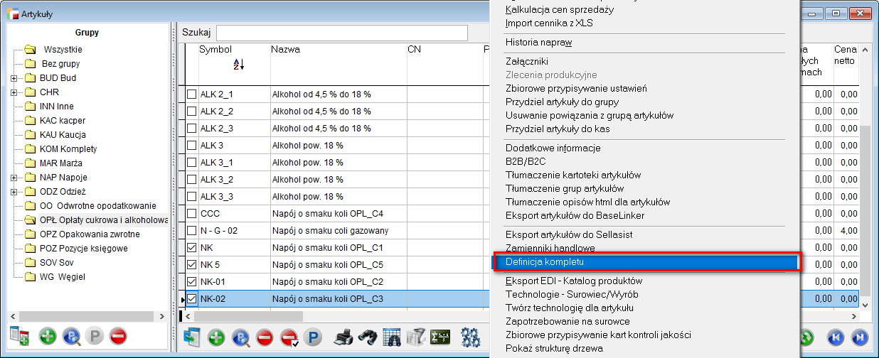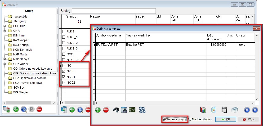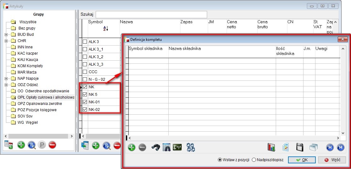 Jeżeli nie zostanie zaznaczony żaden artykuł, program działa jak do tej pory i definiuje elementy kompletu dla bieżącej pozycji, na której ustawiony jest kursor.