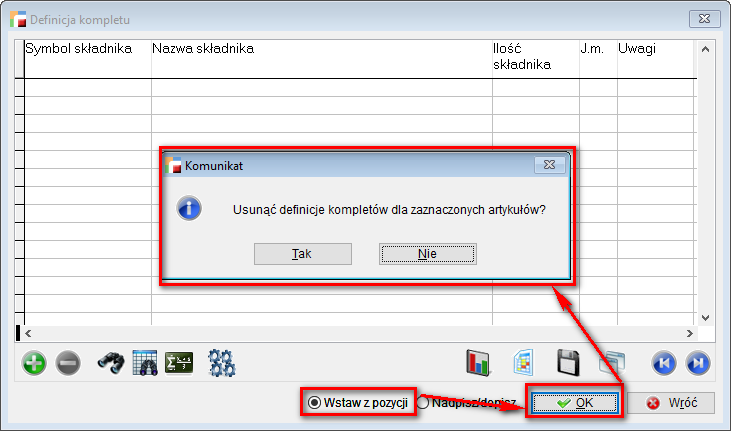 Aby usunąć istniejące definicje kompletów dla zaznaczonych artykułów, przy pustej definicji kompletu należy wskazać opcję Wstaw z pozycji i wybrać przycisk OK.