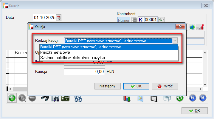 Po wskazaniu rodzaju będzie pobrana jednostkowa wartość kaucji z definicji.