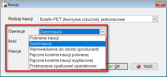 Dostępne są Sprzedaż (pobranie kaucji) oraz Wprowadzenie kaucji do obrotu.