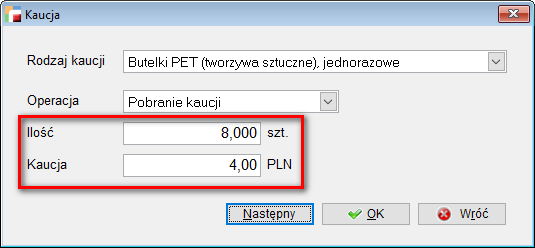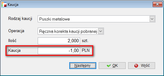 Wartość kaucji wyliczy się po podaniu ilości, ale można ją zmienić ręcznie.