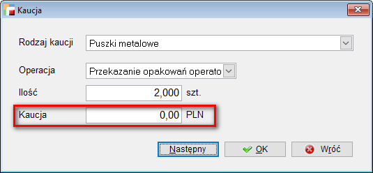 Przekazanie opakowań operatorowi domyślnie nie oblicza wartości kaucji.