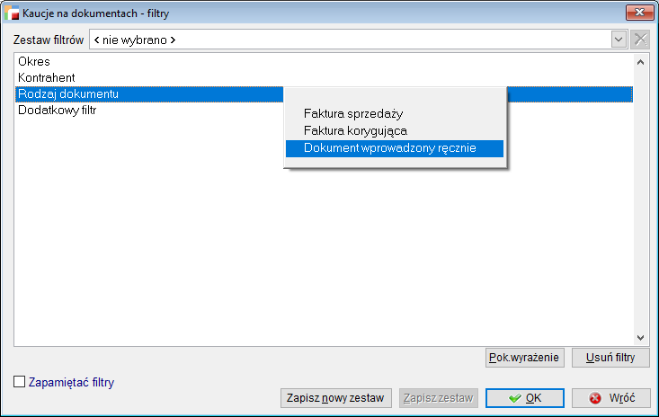Dodatkowo, na liście Kaucji na dokumentach, pod przyciskiem F8, dostępne są filtry.