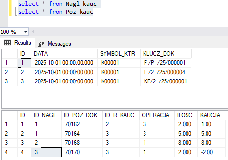 Podczas dodawania pozycji do tabeli POZ_KAUC zakładany jest rekord w NAGL_KAUC. Należy pamiętać, że usunięcie ostatniej pozycji dotyczącej danego dokumentu z tabeli POZ_KAUC powoduje automatyczne usunięcie rekordu z tabeli NAGL_KAUC.