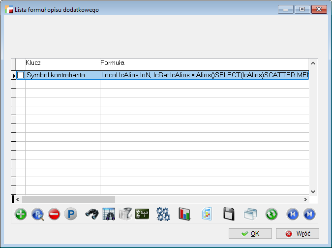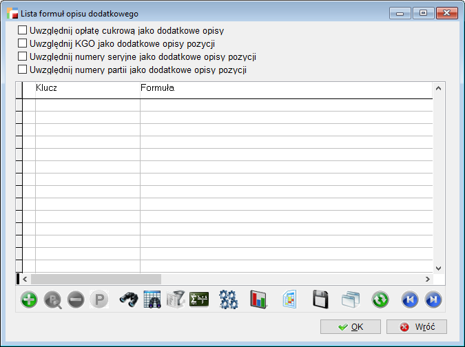 W oknie konfiguracji schematu dostępny jest przycisk Definicja dodatkowych opisów nagłówka, który otwiera okno Lista formuł opisu dodatkowego.