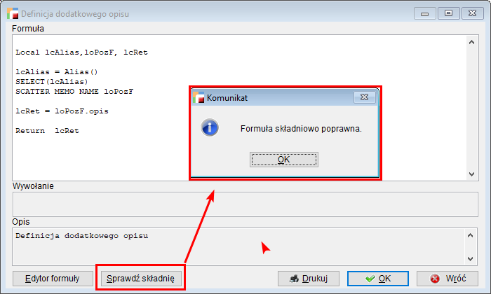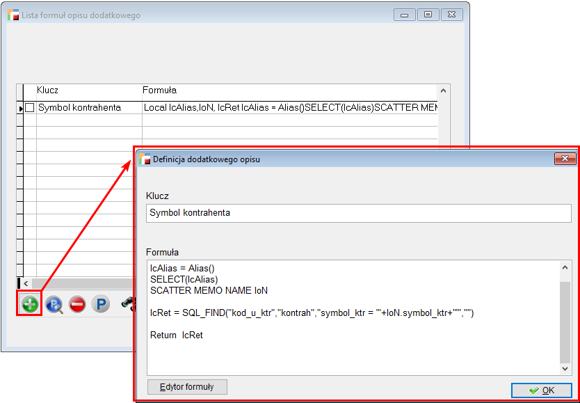 Przycisk Edytor Formuły otwiera dodatkowe okno zawierające pole z kodem formuły.