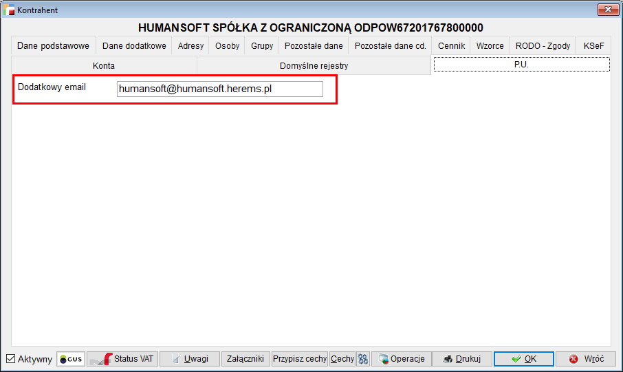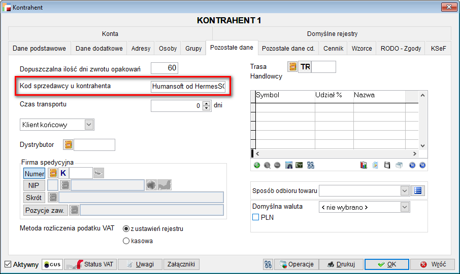 Użytkownik może jednak zmienić zachowanie systemu i sprawić, aby w tagu była pobierana wartość z innego pola, np. z dodatkowego pola zdefiniowanego w kartotece kontrahenta.