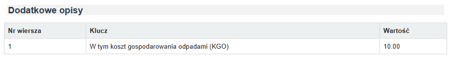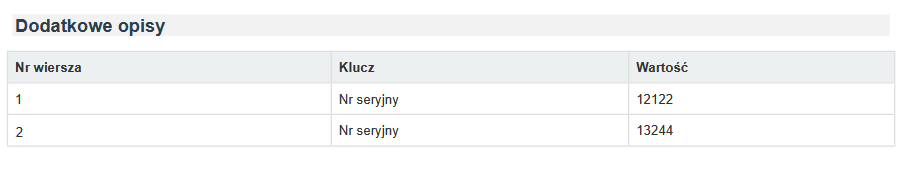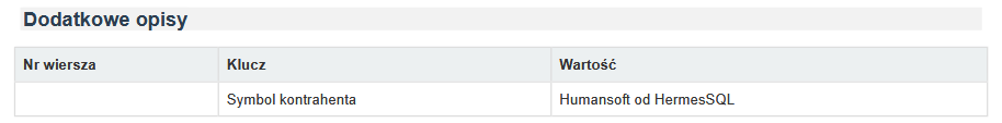Dzięki temu mechanizmowi użytkownik może w ramach dodatkowego opisu zdefiniować własny klucz oraz wartość pobieraną z systemu, co pozwala na umieszczenie tych danych na fakturze.