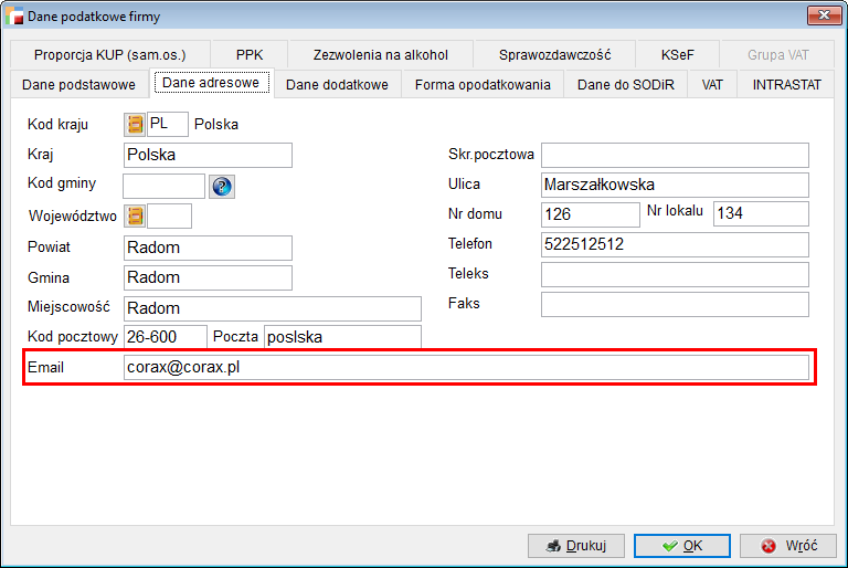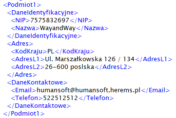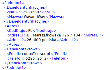 W standardowej konfiguracji systemu tag dla Podmiotu 1 uzupełnia się automatycznie na podstawie Danych podatkowych firmy, dokładnie z pola E-mail znajdującego się na zakładce Dane adresowe.