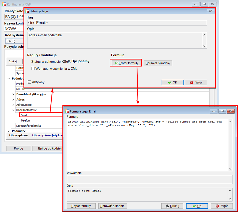 2. W tagu Podmiotu 1 wpisać kod, który pobierze e-mail z wybranego pola kontrahenta.