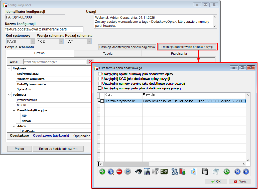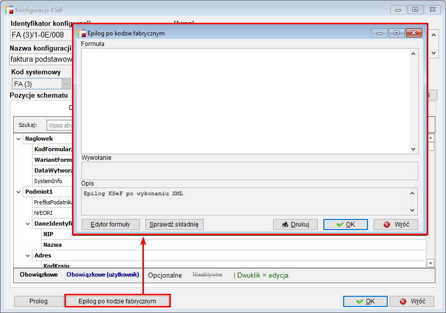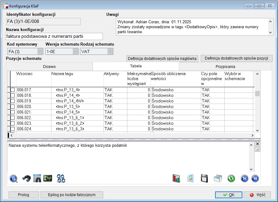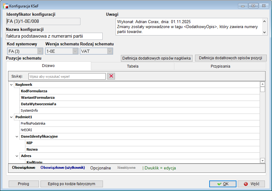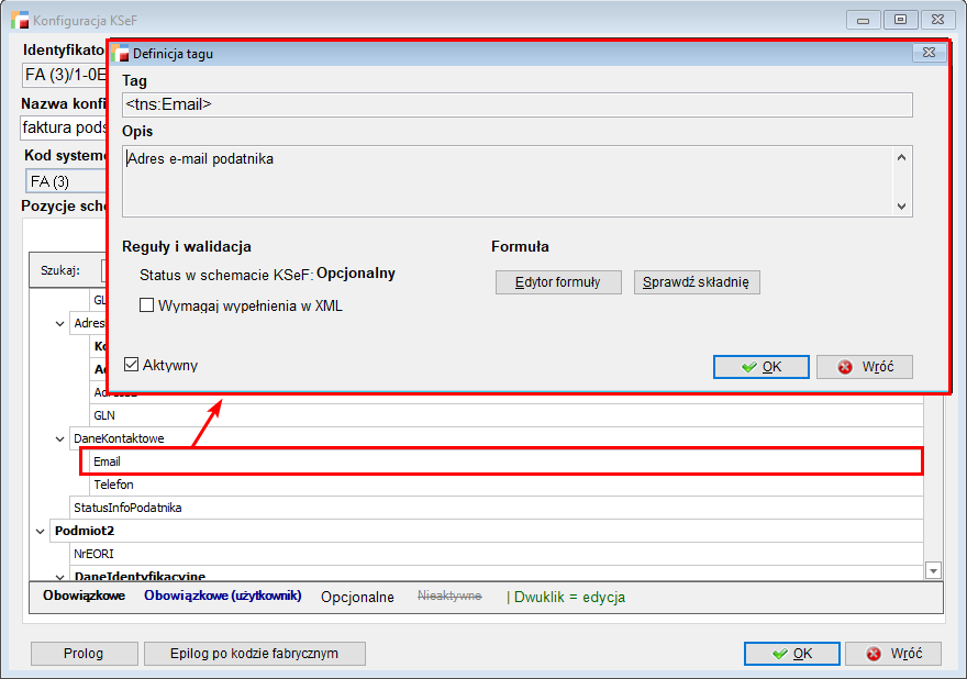 - Obowiązkowe – oznaczenie tagu wymaganego przez KSeF. Jego aktywacja jest konieczna do prawidłowej walidacji dokumentu; brak wypełnienia skutkuje błędem walidacji.