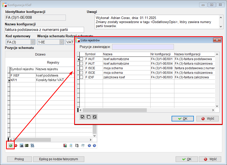 Należy pamiętać, że po kliknięciu przycisku Plus w oknie listy rejestrów wyświetlone zostaną tylko te rejestry, które nie mają przypisanego żadnego schematu sprzedaży oraz w swojej definicji posiadają opcję Dokument ma trafiać do KSeF zaznaczoną na Tak.