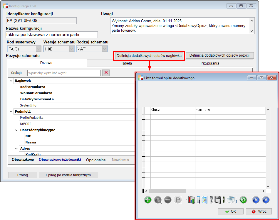 Przycisk Definicja dodatkowych opisów nagłówka otwiera okno Listy formuł opisu dodatkowego.