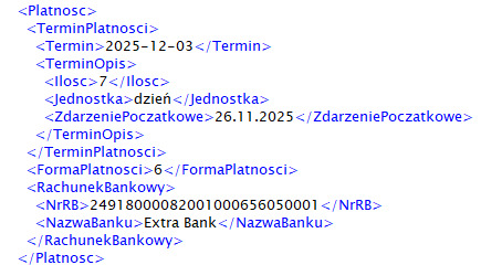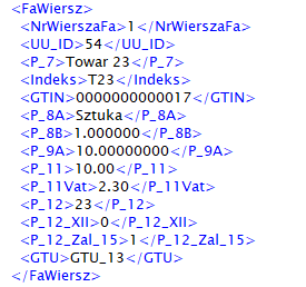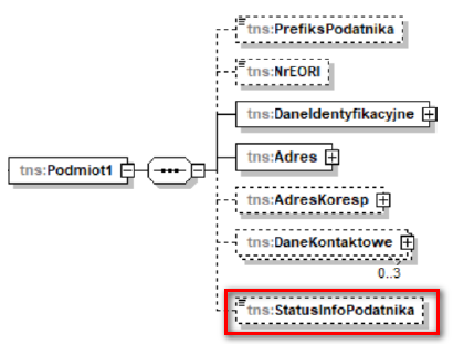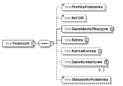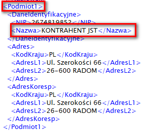 Sekcja Podmiot1 zawiera podstawowe informacje o firmie wystawiającej dokumenty sprzedaży.