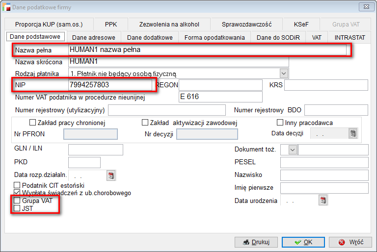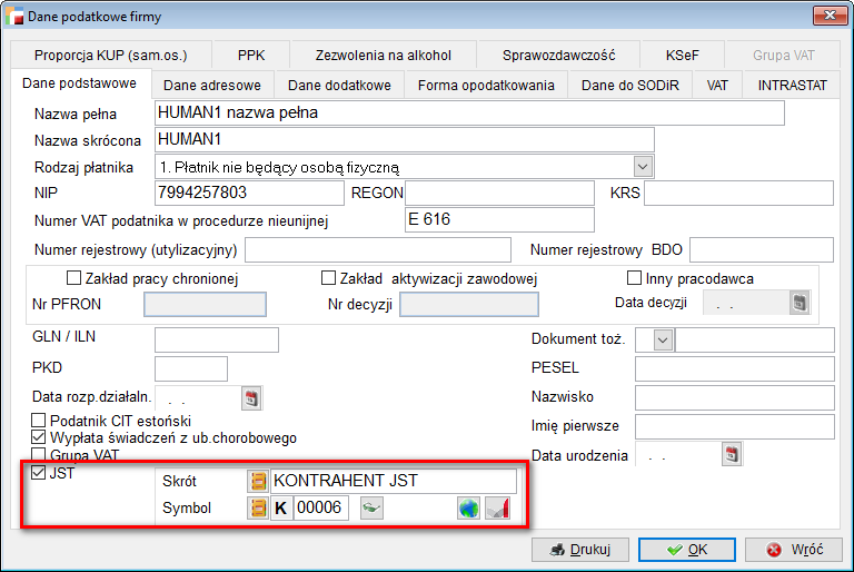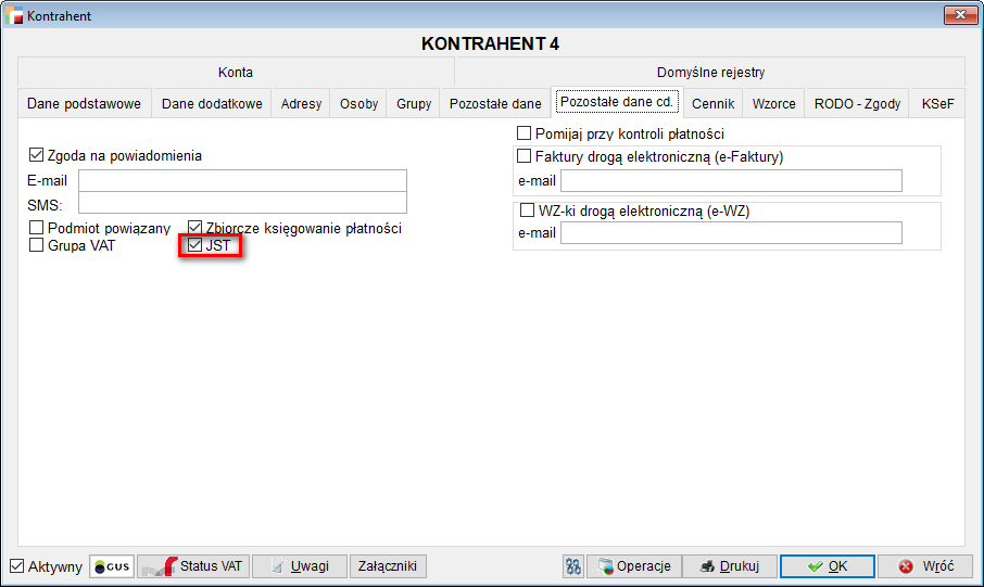 Firma może zostać oznaczona jako JST Jednostka samorządu terytorialnego oraz mieć wskazany podmiot nadrzędny.