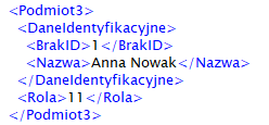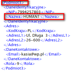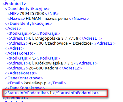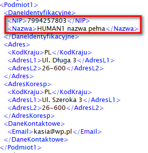 Do sekcji DaneIdentyfikacyjne pobrane zostaną wymagane dane, tj. NIP oraz Nazwa.