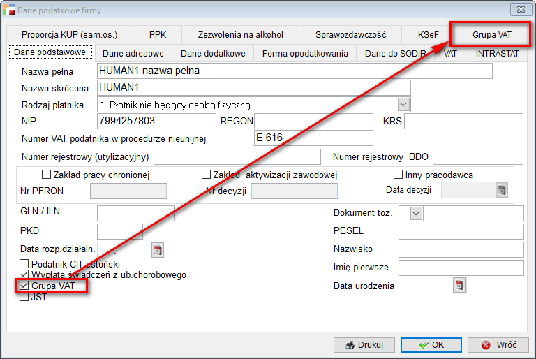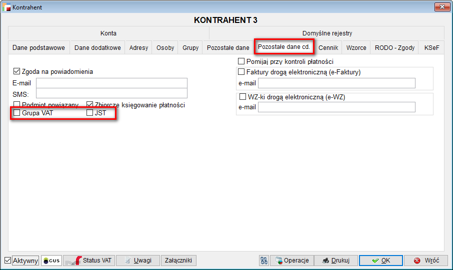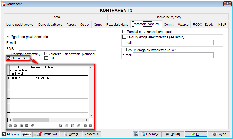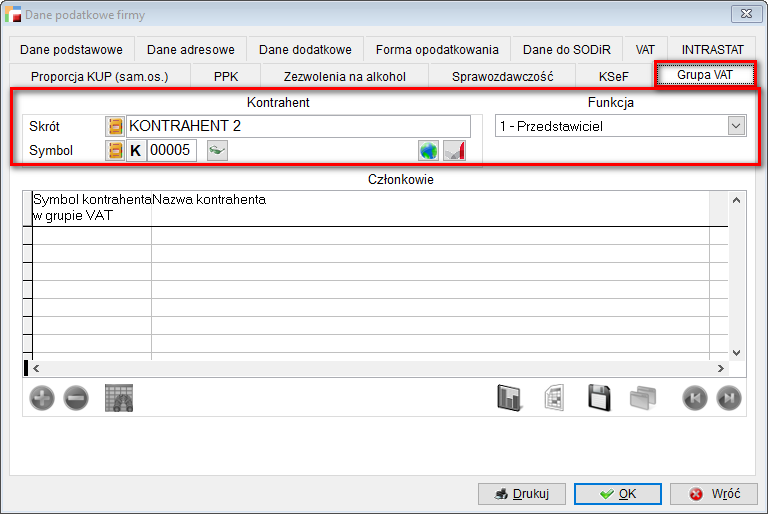 Jeśli firma zostanie oznaczona jako Grupa VAT, wówczas uaktywniona zostanie zakładka Grupa VAT, na której można wskazać przedstawiciela grupy jako nadrzędnego kontrahenta.