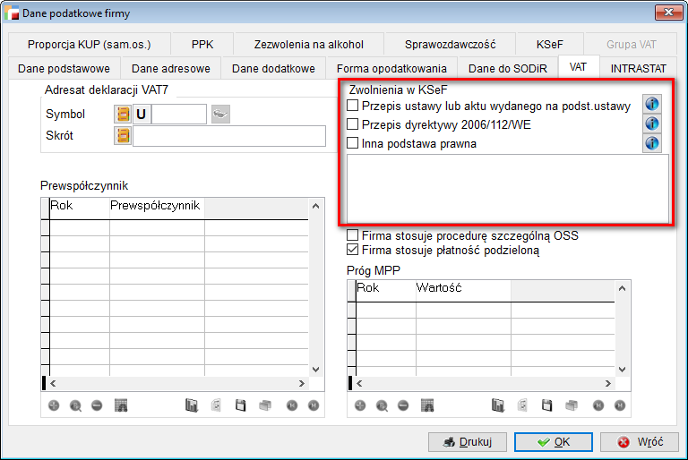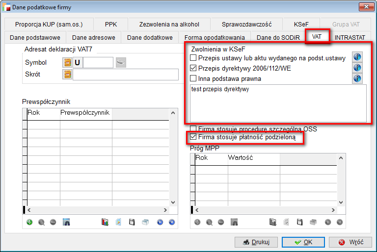 Zakładka VAT umożliwia określenie pól wymaganych w sekcji Adnotacje, dla struktury elementu Fa, takich jak oznaczenie dotyczące stosowania płatności podzielonej jak również informacje dotyczące Zwolnień.