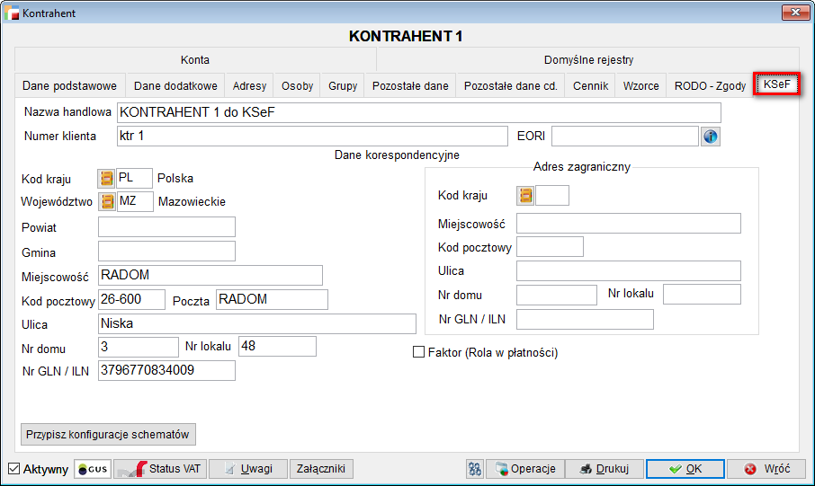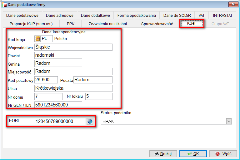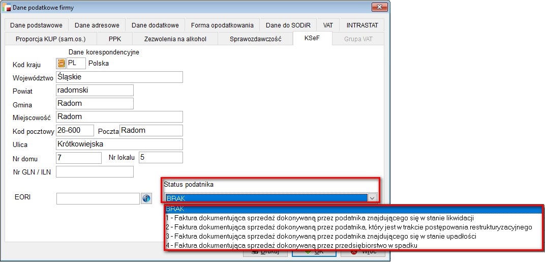 W zakładce KSeF możliwe jest wypełnienie danych korespondencyjnych jak również wskazanie Statusu podatnika.
