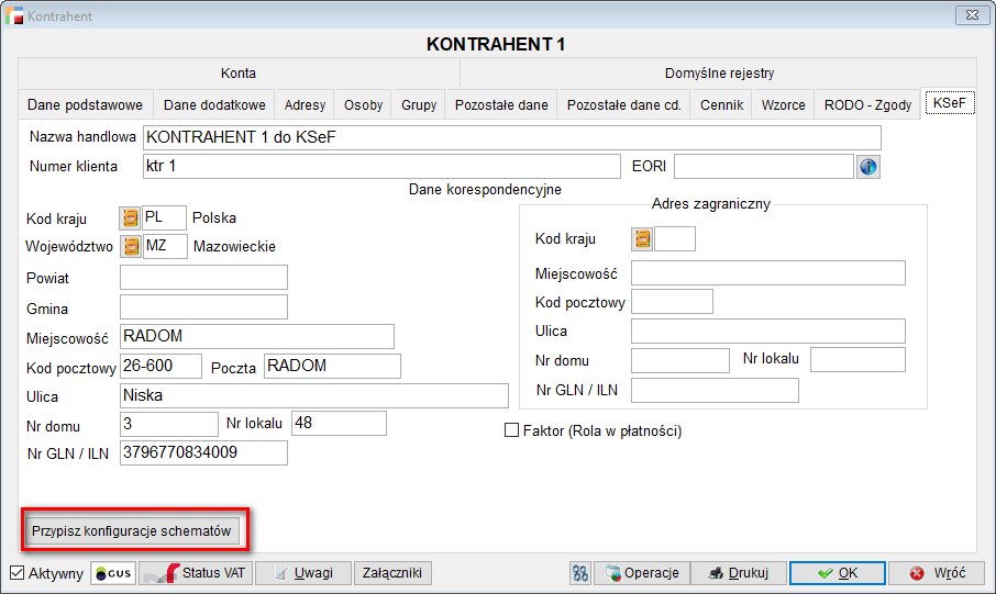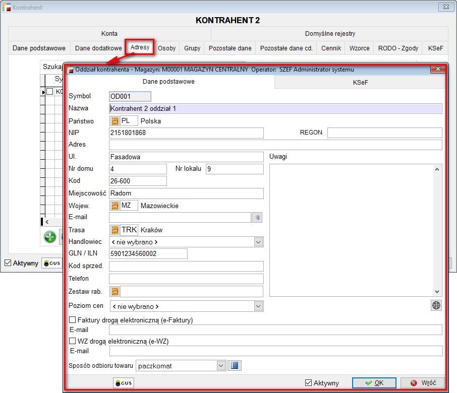 Jeśli zostaną zmienione przez użytkownika, wówczas system potraktuje je jako dane korespondencyjne, wypełniając tymi danymi sekcję AdresKoresp. Sekcja ta zostaje wypełniona nawet w przypadku takiego samego adresu. Do pliku xml przenoszone są również informacje o numerze EORI oraz GLN, o ile zostały wypełnione.