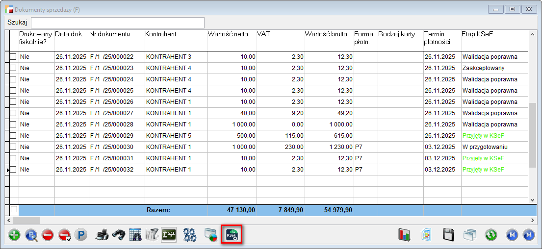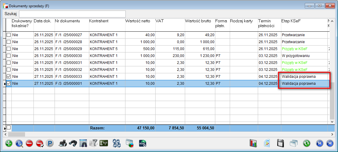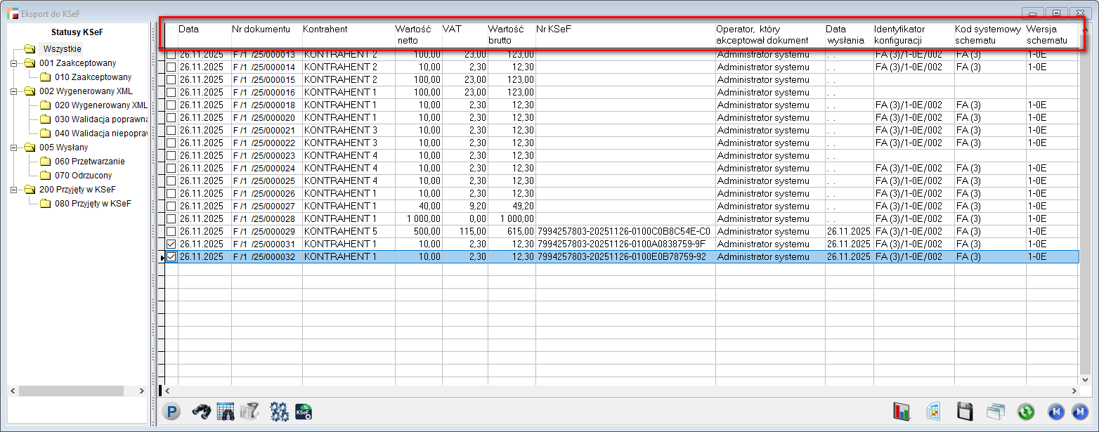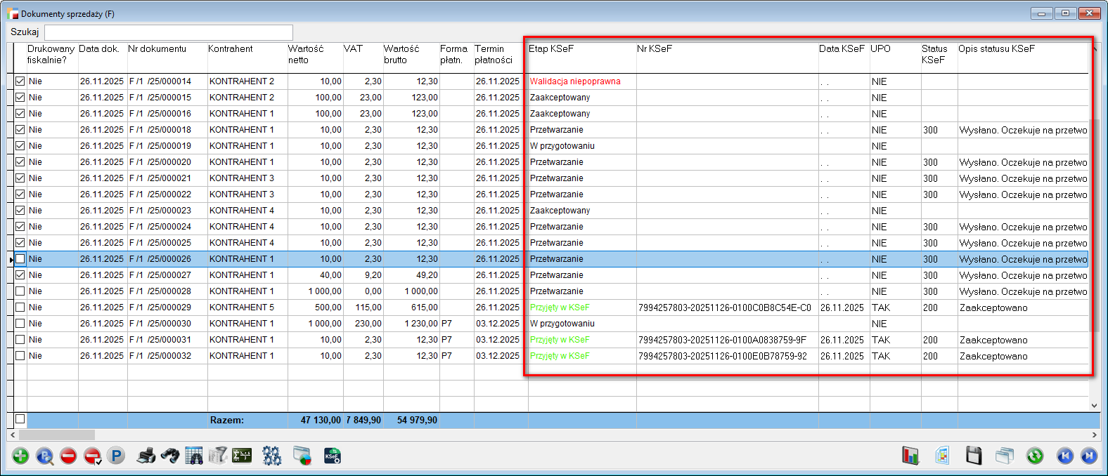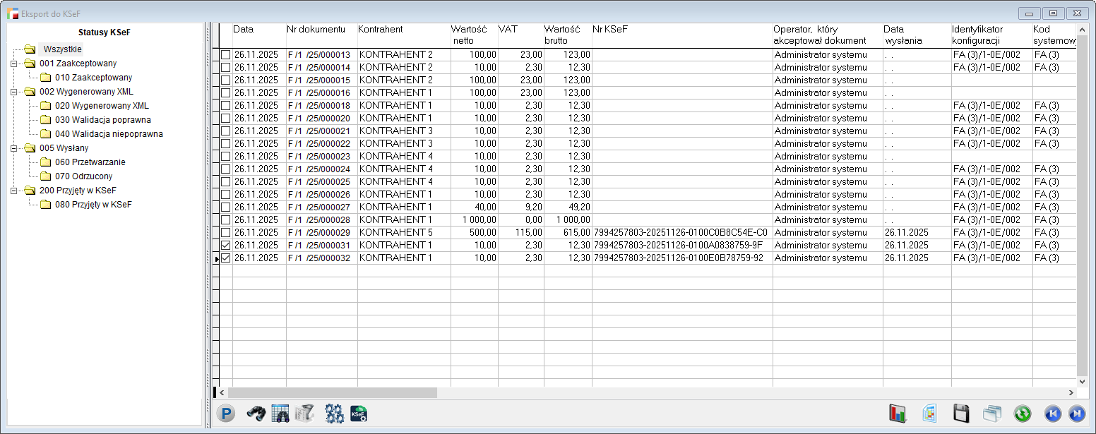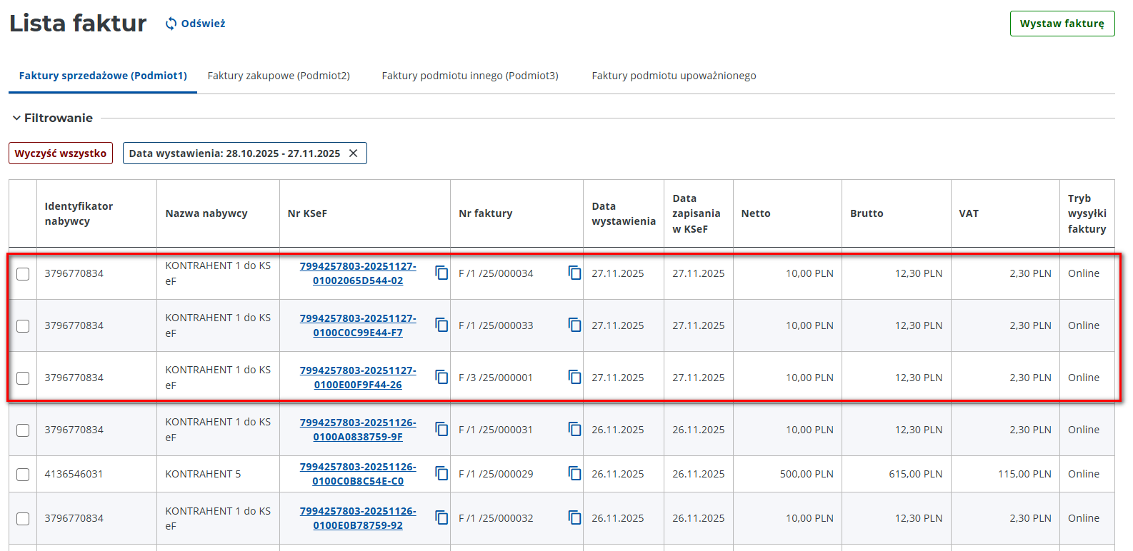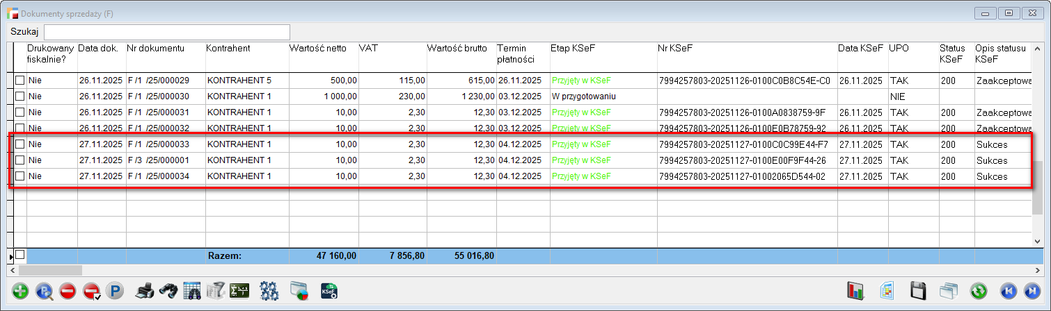 Poprawna wysyłka dokumentów, które otrzymały status 200 oraz UPO będzie skutkować nadaniem numeru KSeF i statusem KSeF oznaczonym jako Sukces.