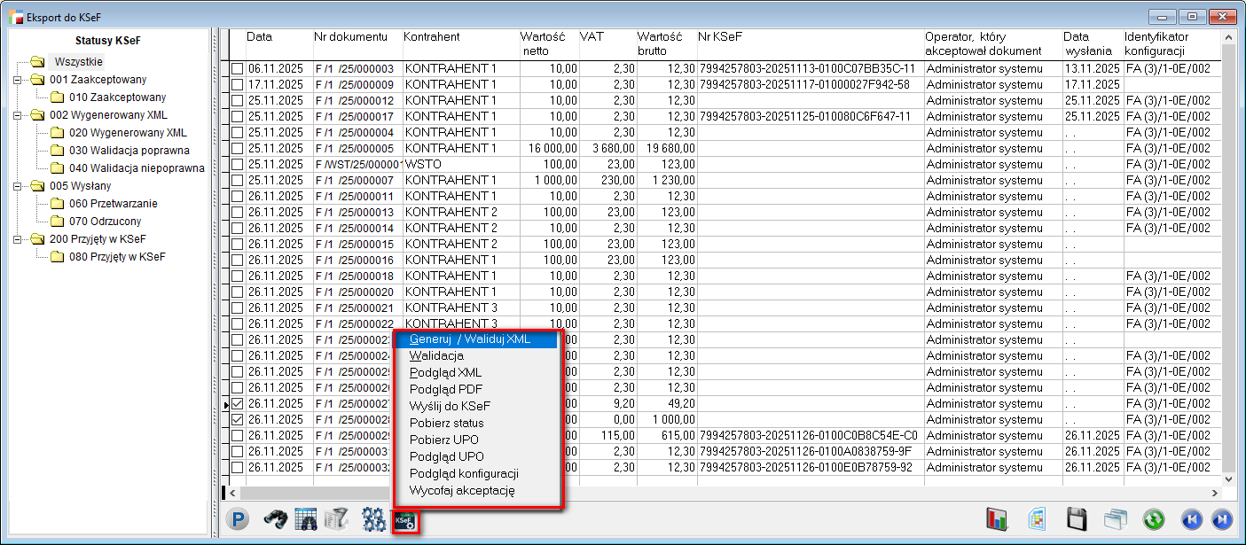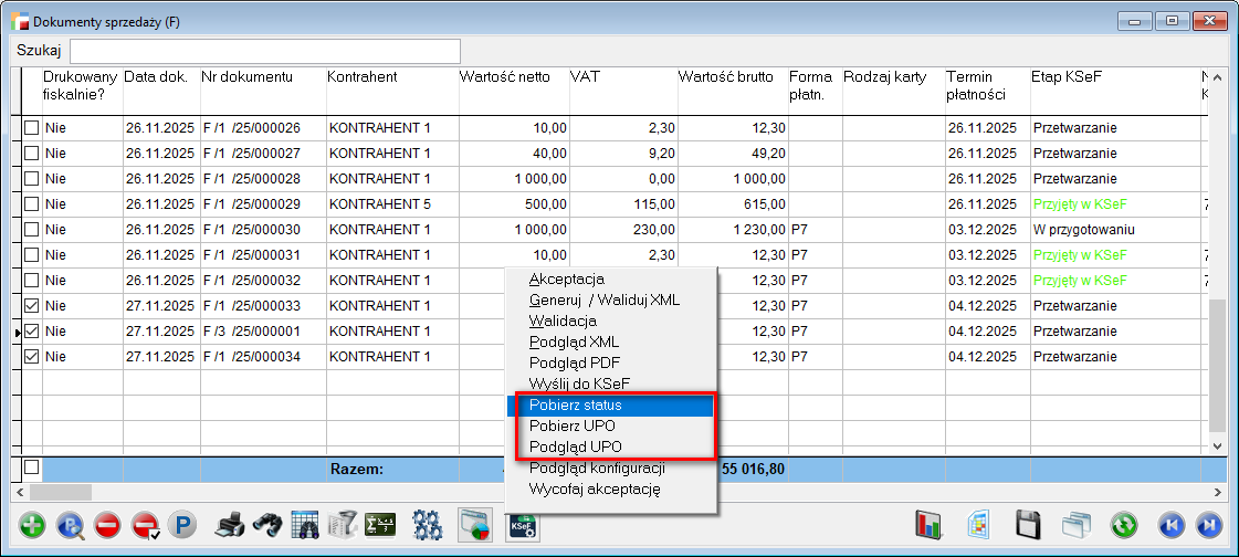 Opcje Pobierz status, Pobierz UPO i Podgląd UPO, dotyczą dokumentów wysłanych do KSeF i w zależności od etapu, na jakim znajduje się dokument, będą zwracać odpowiednie komunikaty.