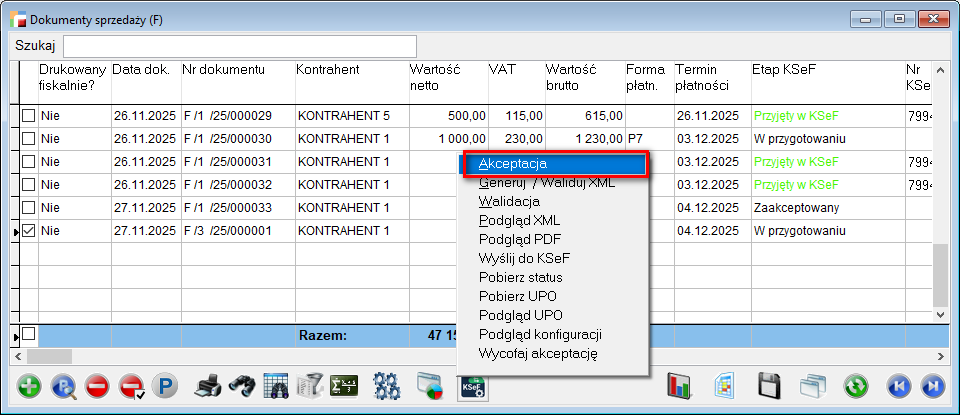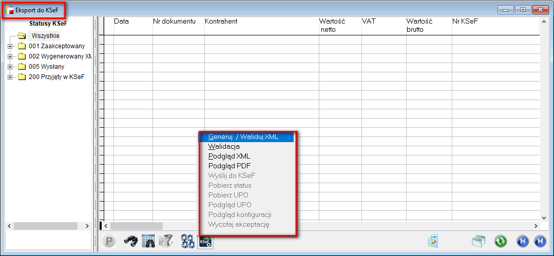 Przed wygenerowaniem pliku XML należy zaakceptować dokument do KSeF.