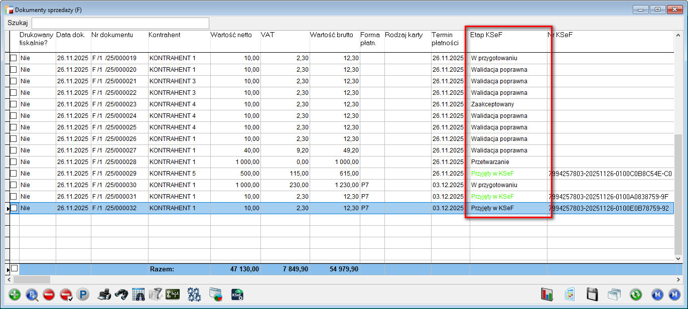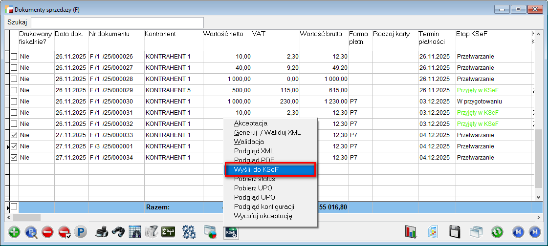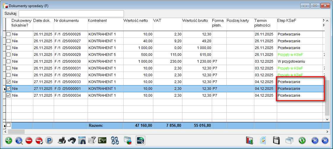 Dokumenty wysłane do KSeF otrzymują status Przetwarzanie.