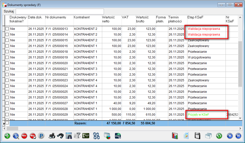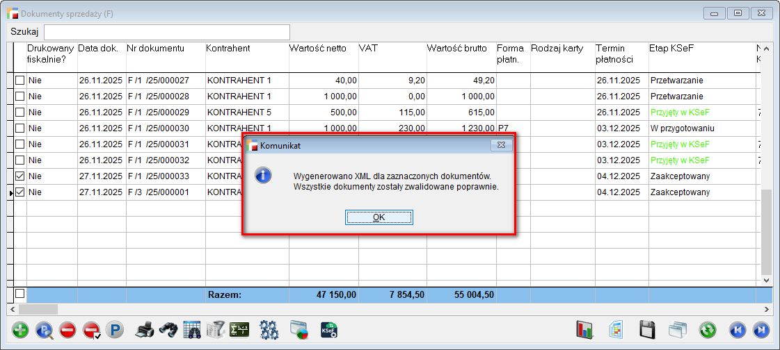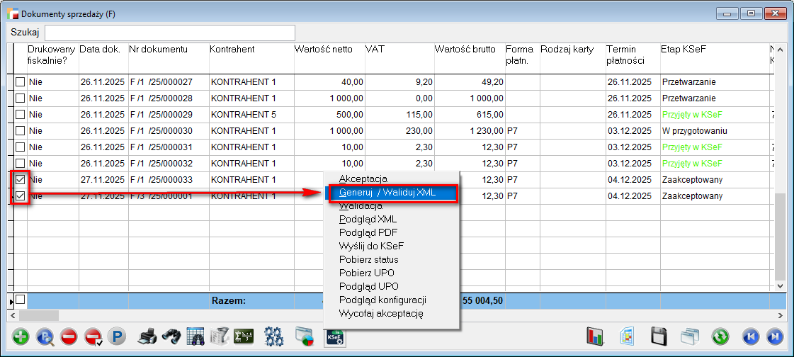 - Ponownie zaakceptować, wygenerować i zwalidować plik XML, a następnie spróbować wysłać dokument do KSeF.