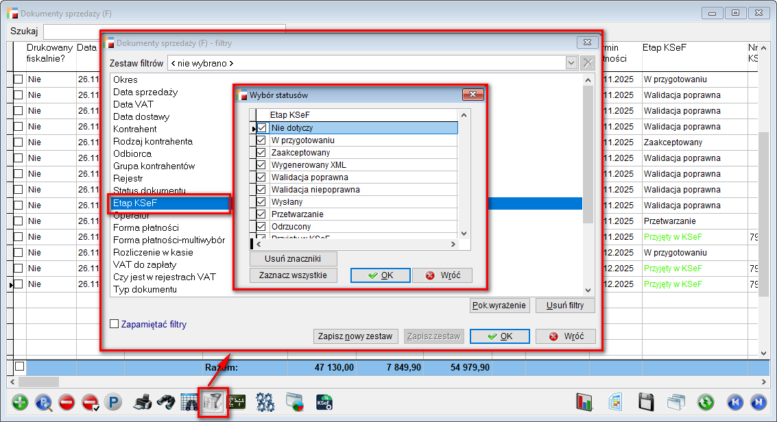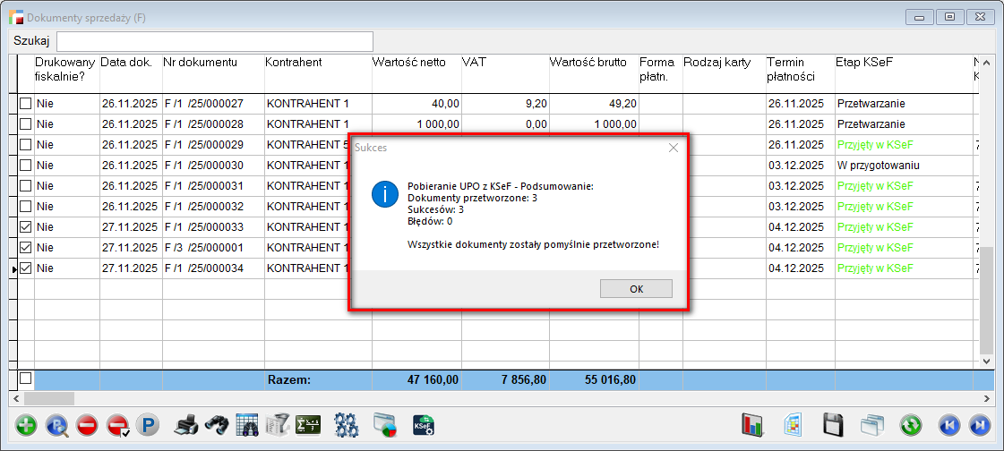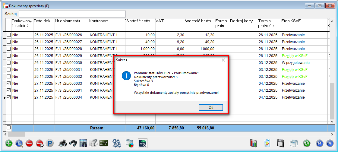 Prawidłowe Pobranie statusów KSeF będzie skutkować stosownym komunikatem i statusem Przyjęty w KSeF.
