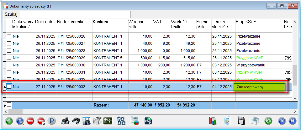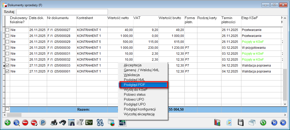 Dla dokumentów o statusie Przyjęte w KSeF można pobrać Urzędowe Poświadczenie Odbioru i ewentualnie je wyświetlić.