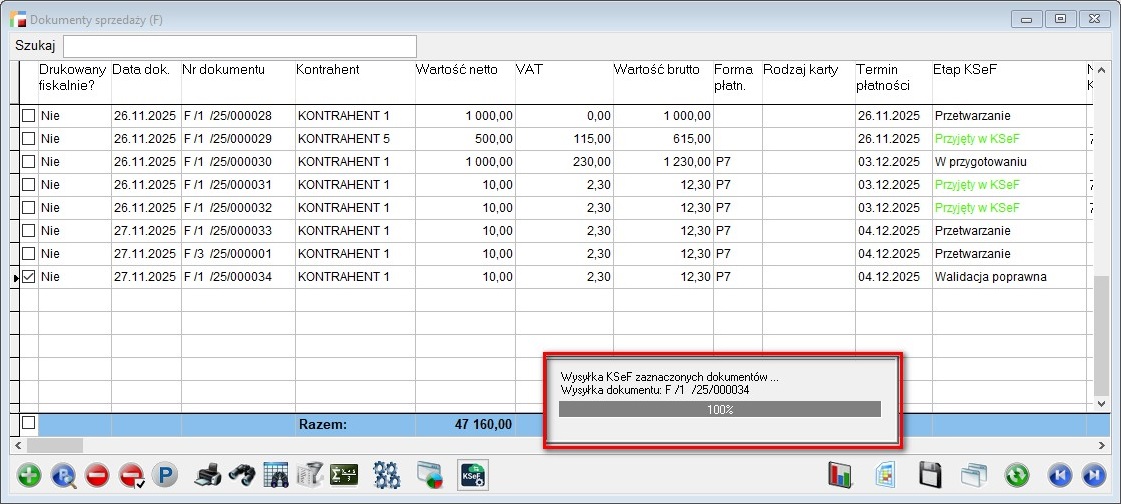 Pasek postępu informuje o przebiegu wysyłki dokumentów.
