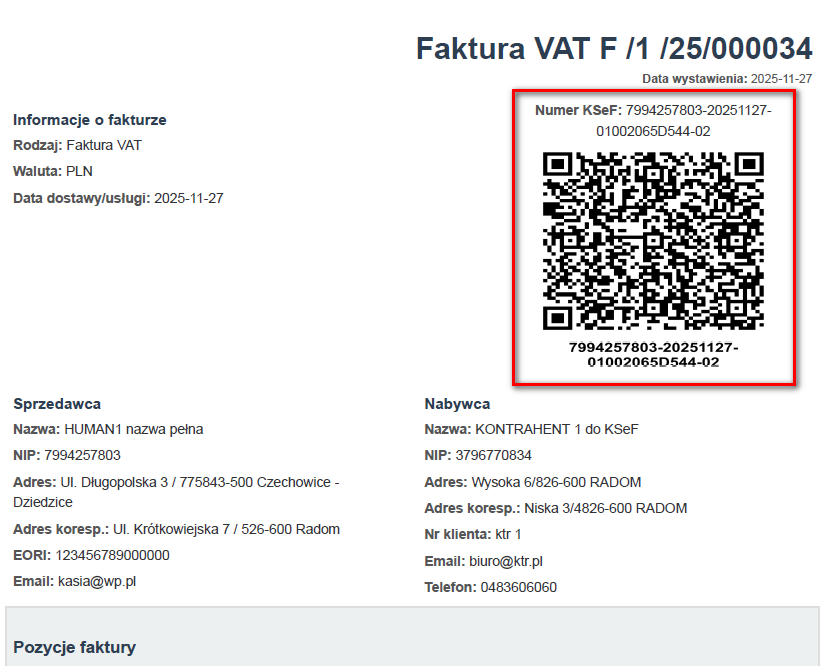 Po poprawnej wysyłce, opcja Podgląd PDF będzie zawierać kod QR z linkiem, którym można się posługiwać w celu pobrania faktury.